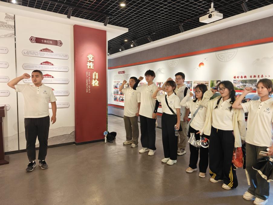 最后,团队前往青山镇yl8858永利集团党员党性教育基地,通过资料图片、文字记载以及人物故事学习红色事迹,感悟红色精神。在党旗前,指导老师杨海城带领团队成员重温入党誓词,以铮铮誓言砥砺初心,为意义非凡的首日实践画上圆满句号。
