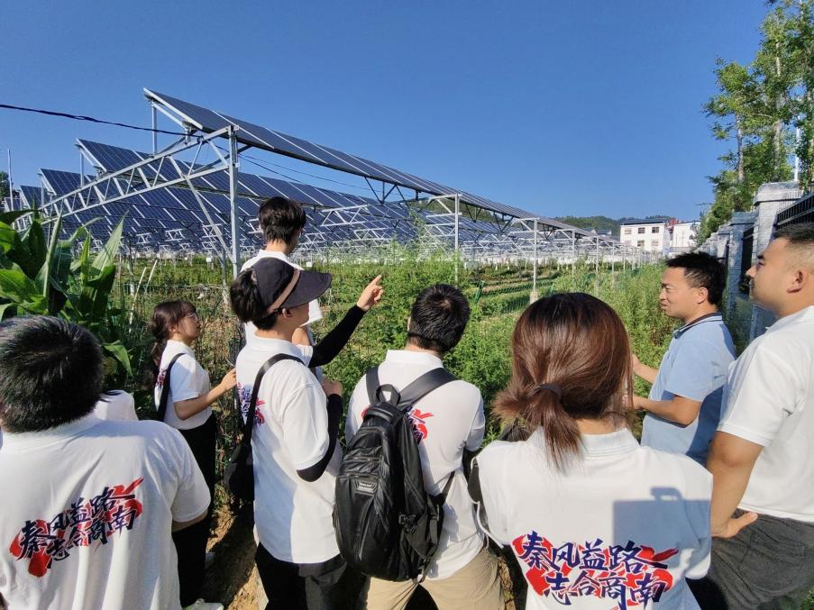 之后,实践团队前往青山镇具有代表性的农光互补示范项目——光伏发电基地。该项目采用“板上发电、板下种植”立体模式,在常规发电功能之外,光伏板下规模化种植油茶、香菇等作物,实现土地高效复合利用,通过清洁能源生产与特色农业协同发展,为村民提供就业增收新路径。