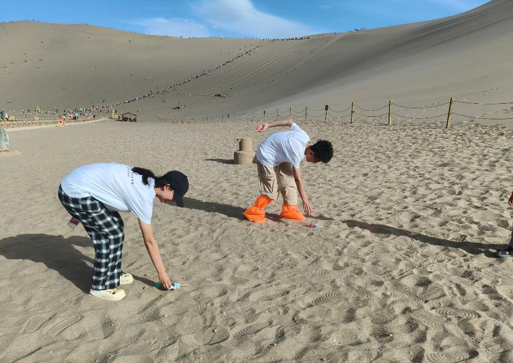 实践队同步启动“绿色守护行动”,在鸣沙山脚下及周边沙地清理垃圾。队员们分工协作,俯身捡拾塑料瓶、包装袋等废弃物,以实际行动守护沙漠景观,向游客传递环保意识。这一行动,既是对生态理念的践行,也是实践队“强国精神”在环保领域的具体落地。