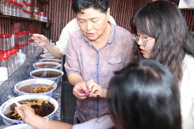 在辣椒坊,实践队员们被陈列在百格木架上的煳辣椒、糟辣椒、油辣椒所吸引。非遗传承人热情邀请队员们品尝坊内的各式辣椒,这些辣椒是工坊主人自己制作的,别具一番风味。通过访谈实践队了解到,这些辣椒采用传统的晒、腌、剁、封非遗工艺窖藏制作而成,已成功通过电商平台销往全国,生动展现了“舌尖非遗”的蓬勃活力。