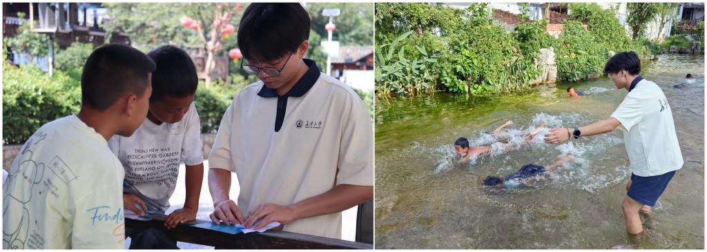 实践队设计专项问卷并走访调查200余人,系统梳理出了龙井村村民的语言习惯、推普难点及非遗认知基础;面向村中儿童策划游泳竞赛、创意折纸等文体活动,在游戏互动中教授、推广普通话;协助举办篝火晚会并实时直播,将铜鼓舞、转场舞等非遗展演推向云端,吸引互动点赞超2万次,用数字技术助力布依古歌焕发新生。