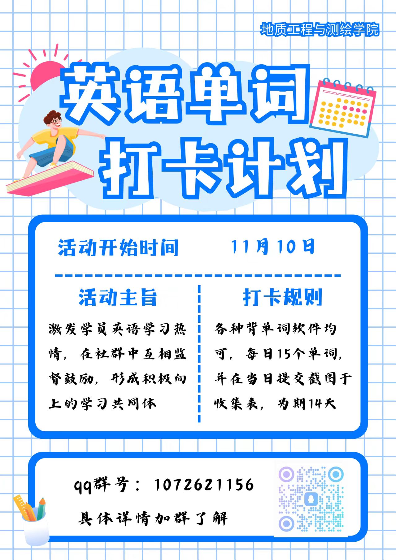 扫描下方二维码或搜索QQ群号:1072621156;入群后完善信息,开启你的14天单词挑战之旅!地测学院学生会期待同学们的积极参与,加入我们单词打卡的行列,备战四级,拥抱更好的自己,迎接光明的未来