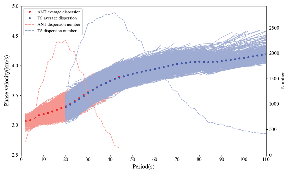 图2.频散曲线及每周期对应的频散数。