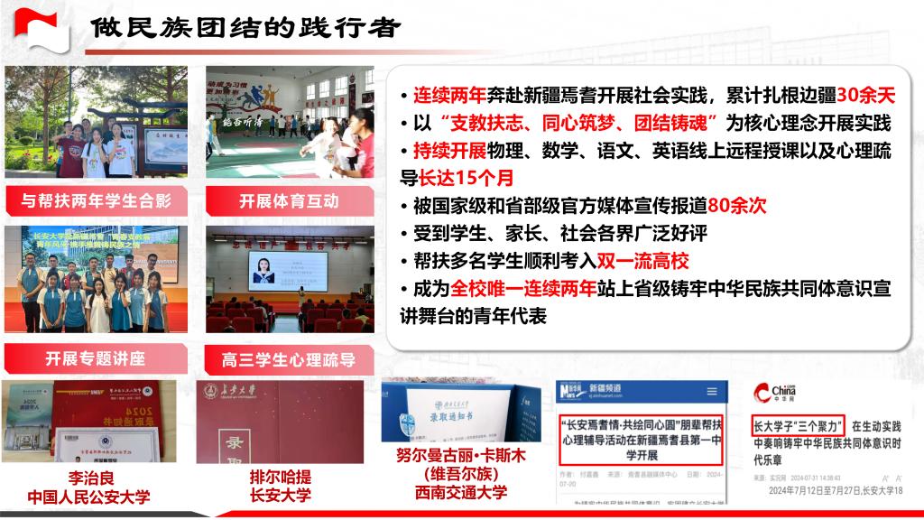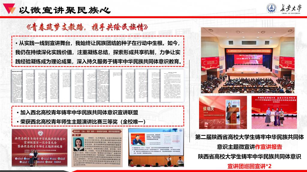 这份“求真”的表达,始于实践却不止于实践。实践结束后,她注重情感联结与长期陪伴。从实践中沉淀的真知,成为她传播思想力量的源头活水。她以新疆焉耆的实践经历为基础,系统梳理各民族交往交流交融的鲜活案例,将宏大理论转化为感人故事,从yl8858永利集团到陕西高校,再到西北区域,她让“铸牢中华民族共同体意识”的理论在具体可感的叙事中深入人心。这些荣誉既是对她宣讲能力的肯定,更是对其“以真故事传真理”求真精神的精彩印证。
