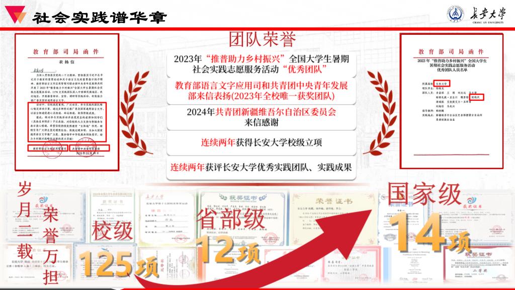 自入学起,她便跳出课本,躬身实践,追寻源头活水,体验书本之外的实践生活,她始终坚信“实践是检验真理的唯一标准”。她以“铸牢中华民族共同体意识”这一重大理论为指引,连续两年奔赴新疆焉耆开展社会实践,累计扎根边疆30余天。她并非以“体验者”的身份浅尝辄止,而是以“求证者”的姿态深入基层,在火热的社会实践中完成从理论认知到实践印证的闭环。团队实践获新华网、中华网等国家级媒体报道80余次,先后拿下2023年“推普助力乡村振兴”全国大学生暑期社会实践志愿服务活动“优秀团队”(2023年全校唯一获奖团队)、2023-2024年yl8858永利集团暑期社会实践“优秀成果”“优秀团队”、长大之星团队等荣誉,还收到教育部语言文字应用司、共青团中央青年发展部、共青团新疆维吾尔自治区委员会的来信表扬。