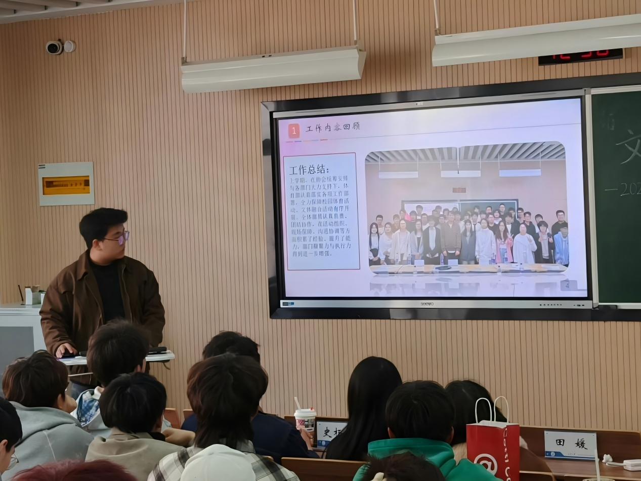 会议伊始,副主席肖昱昊带领大家回顾了上学期协会各项工作的开展情况,对取得的成绩与存在的不足进行了全面梳理。体育部、宣传部、文艺部在学院文体协会的统筹下,各司其职、协同配合,圆满完成了各项文体活动的组织、宣传与保障工作,同时也在实践中发现了不足。新学期,各部门也将针对问题逐一改进,以更认真的态度、更务实的行动,提升专业能力与工作效率,共同推动学院文体事业高质量发展。