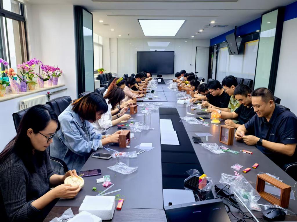 活动现场准备了丰富的手工材料。教师们兴致盎然,在融洽的氛围中相互协作,巧手制作莲花灯。折灯丝、粘花瓣、贴荷叶……一道道工序有条不紊,一盏盏花灯渐次绽放,展现了教师们严谨之外的心灵手巧与生活情趣,现场暖意融融、笑语盈盈。