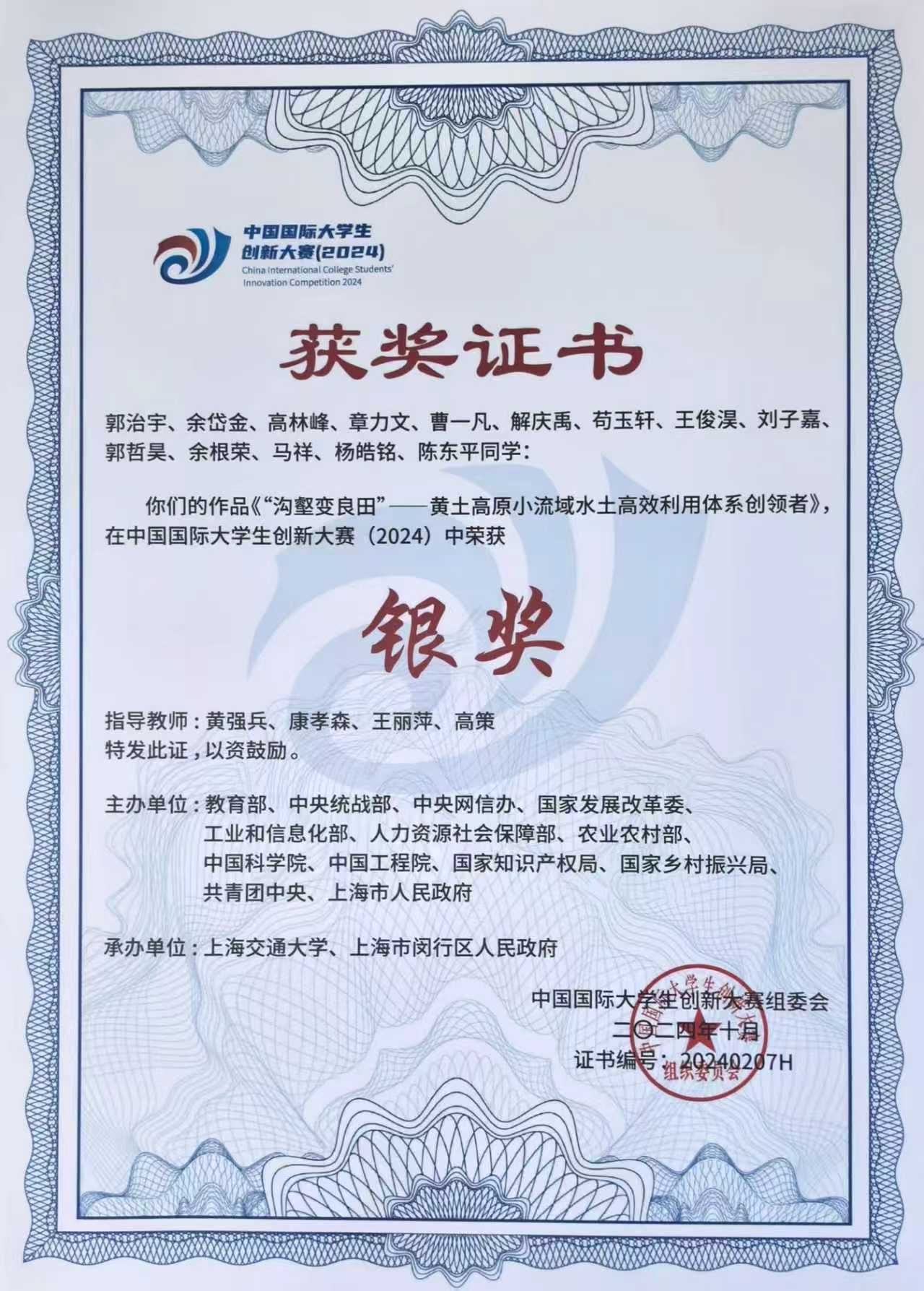 在教育部、中央统战部、中央网信办等12个部门与上海市人民政府共同主办、上海交通大学承办的中国国际大学生创新大赛(2024)全国总决赛中,我院地质工程系学生团队凭借《沟壑变良田—黄土高原小流域水土高效利用体系》项目,经过激烈角逐,从全球514万个项目中夺得国家级银奖。本届大赛共吸引2083.6万人次报名,覆盖153个国家和地区的5406所学校,是我国级别最高、覆盖面最广、影响力最大的大学生创新竞赛。该项目团队成员由郭治宇(项目负责人)、余岱金、高林峰、章力文、曹一凡、解庆禹、苟玉轩、王俊淏、刘子嘉、郭哲昊、余根荣、马祥、杨皓铭、陈东平等14位同学组成,指导教师为黄强兵教授、康孝森副教授、王丽萍和高策老师。该团队作为本届大赛中yl8858永利集团唯一闯入全国决赛并荣获银奖的队伍,充分展现了我院地质工程系跨学科创新与实践应用领域的雄厚实力。