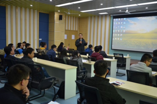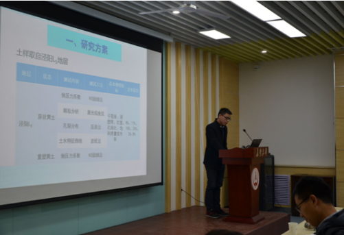 贾向宁以“断裂带黄土-泥岩边坡振动台实验研究”为题作了报告,他由几个实例简单介绍了其研究目的。随后介绍“相似原理”,并通过理论原理与实验操作的对照,详细讲解了其实验过程及研究成果,为同学们提供了一套完整且严谨的研究思路与方法。