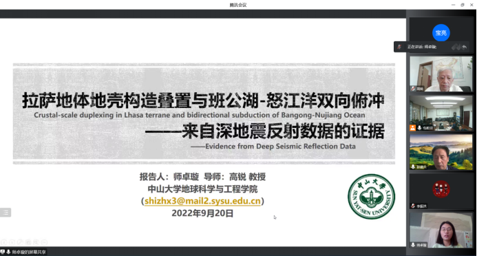 随后,中山大学师卓璇博士从拉萨地体地壳构造叠置与班公湖-怒江洋双向俯冲的研究背景、数据采集与分析、讨论及认识、结论等四个环节介绍了在研究区深地震反射剖面的野外采集及处理工作,结合大地电磁成果与深反射地震资料,认为拉萨地体内部在新生代以地壳尺度的构造逆冲叠置而发生地壳的增厚变形,拉萨地体北侧的班公-怒江洋在中生代发生了双向俯冲并最终导致了大洋消亡。
