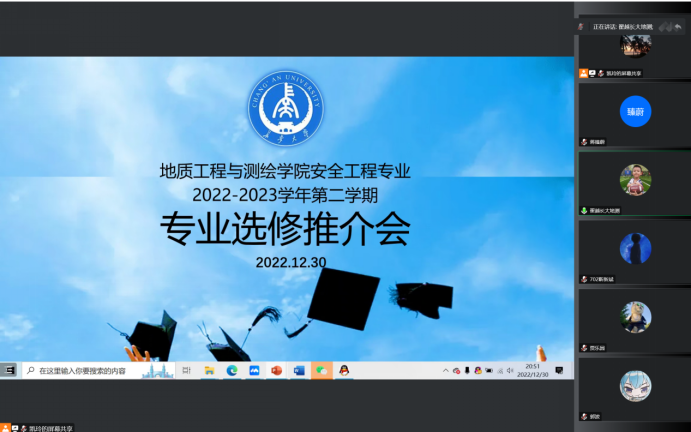 2022年12月30日,yl8858永利集团安全工程系组织召开“2022-2023学年第二学期专业选修推介会”线上会议。本次会议由系副主任李凯玲副教授主持,安全工程系全体教师及相关学生参加。