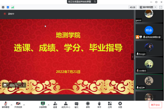为进一步保障学生顺利毕业,我院2022年7月21日20:00以腾讯会议的方式召开成绩、选课与毕业指导专题会议。学院教学副院长邵广周,各系副主任成玉祥、纪新林、杨耘、李凯玲老师,教学秘书赵梓余、教务员高策老师及各年级300名学生在线参会。会议由教学秘书赵梓余主持。