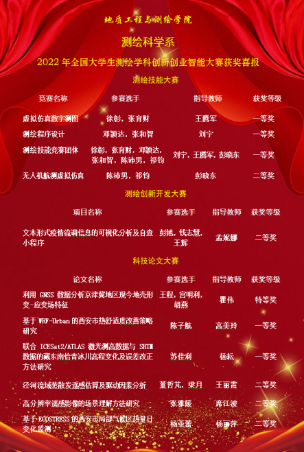 测绘科学在新技术革命的浪潮中迎来了前所未有的机遇和挑战,测绘高等教育也面临着新思维、新使命、新挑战。我院测绘科学系师生通过参与各类竞赛,促进了学生知识、能力、素质的协调发展,践行了以学生为中心、因材施教、个性培养的育人理念,达到了以赛促学、以赛促教、以赛促改的目的。