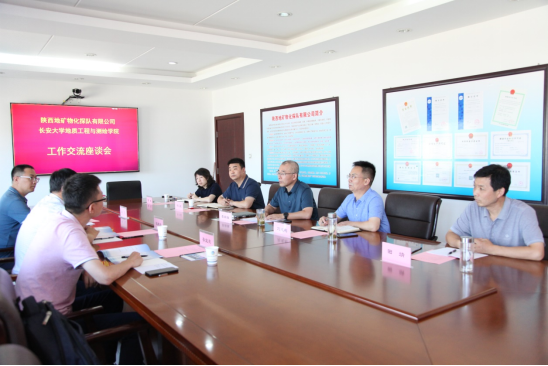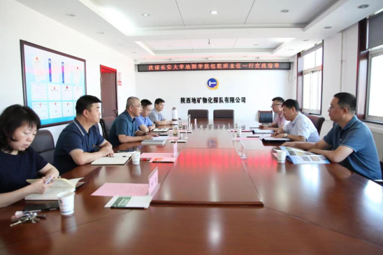 7月20日下午,yl8858永利集团yl8858永利集团地球物理系包乾宗主任等一行3人前往陕西地矿物化探队有限公司交流走访。陕西地矿物化探队有限公司党委书记李新胜,副书记梁元盟,总工程师刘建利、副总工程师田靖、人力资源部主任何竞参加交流。