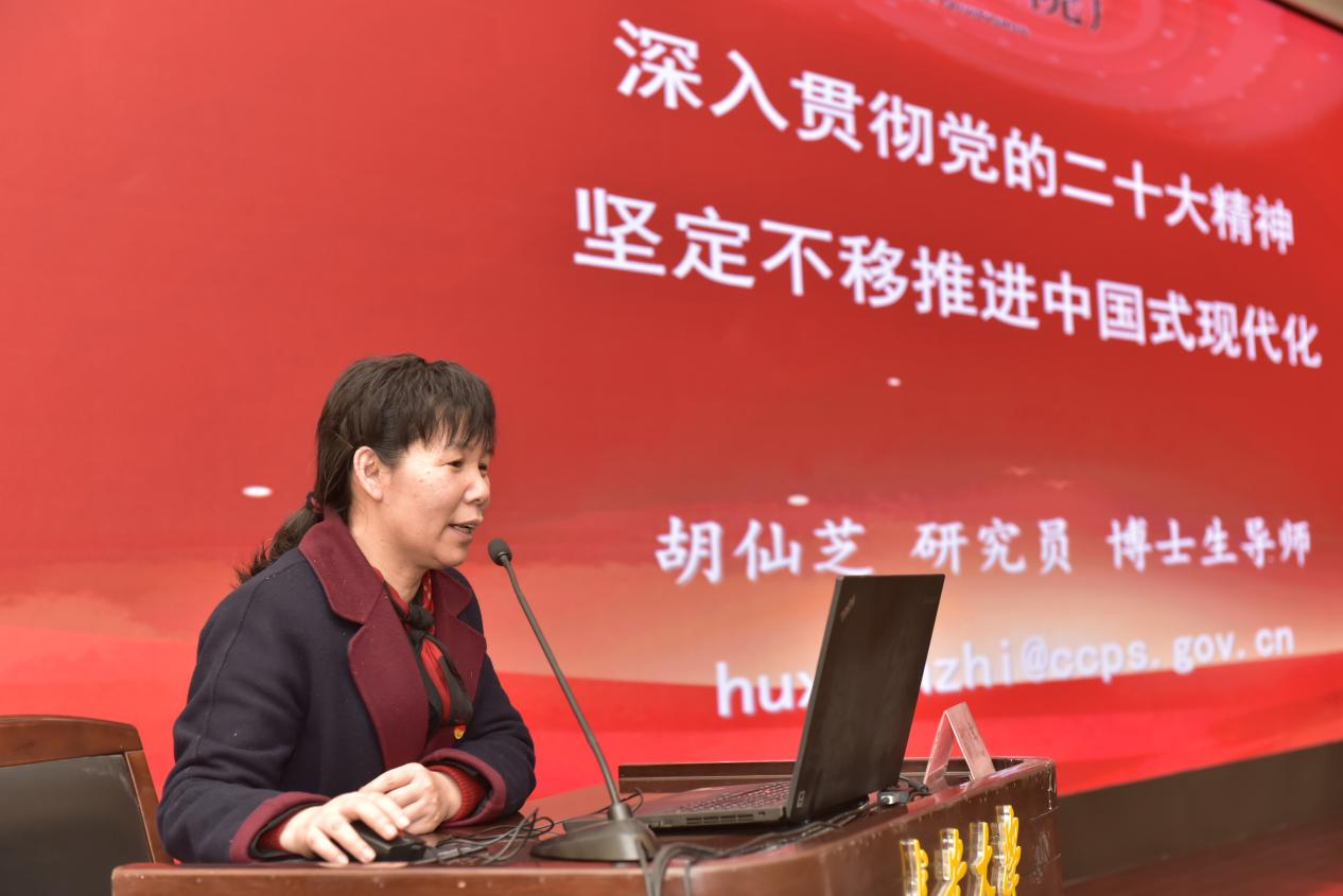胡仙芝作了题为“深入贯彻党的二十大精神 坚定不移推进中国式现代化”的辅导报告,对党的二十大、党的二十大报告以及中国式现代化进行全面解读。详细讲解了党的二十大的召开过程、重要成果和历史意义,从“大会主题““坚实基础““指导思想““中心任务““战略部署““战略保障“六个角度对党的二十大报告进行深刻剖析,以“中国式现代化推进中华民族伟大复兴“为切入点,深入浅出地阐述了中国式现代化的深刻内涵、重要意义和实现路径,对西方式现代化进行了比较和批判,为我们准确把握中国式现代化的科学内涵提供了新视野,为我们如何深入开展学习贯彻党的二十大精神学习活动提供了范例。