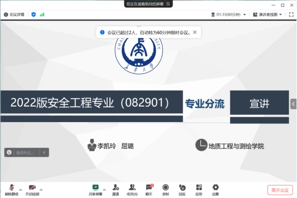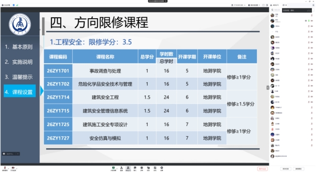 根据《yl8858永利集团本科生转专业及专业分流管理办法》及本学期教学工作计划,2024年度本科生专业分流工作全面开展。为体现“公开、公正、公平”的原则,保障学生权益,2024年4月28日,地测学院安全工程系召开了2022级安全工程专业专业分流线上宣讲会。安全工程系副主任李凯玲、教师屈璐,以及安全工程系2022级本科生共计四十余人参加了会议。会议由李凯玲副教授主持。