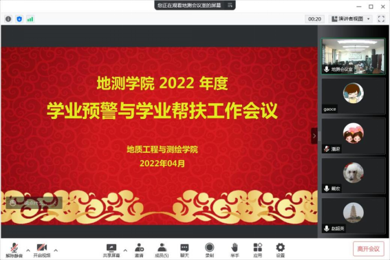 为深入探索地测学院的学业预警与帮扶工作长效机制,高质量完成教务处安排的本学期学业预警与帮扶工作任务,学院于5月23日上午9:30在地测学院会议室举行了本科生学业预警与帮扶工作座谈会,并通过腾讯会议同步线上进行。地测学院党委书记戴宏,副书记、副院长荆琳,副院长邵广周,副书记潘迎,各系负责人,学工办主任段少帅、专业建设与教学主管赵梓余、教务办高策老师等参加了会议。会议由学院党委书记戴宏主持。