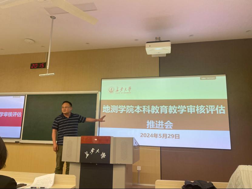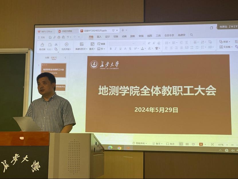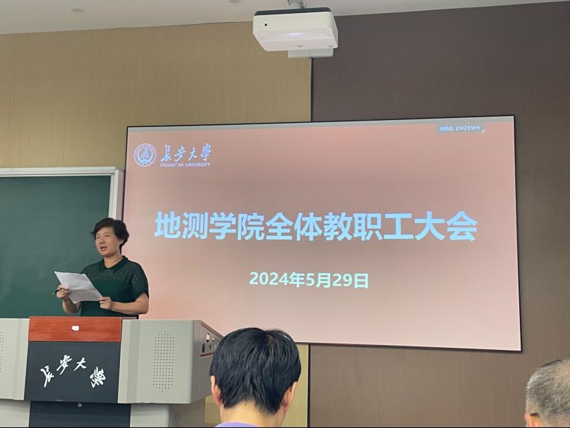 5月29日,地测学院在南校区东院第二教学楼阶二教室召开全体教职工大会。会议分两个阶段,第一阶段是学院副院长岗位会议推荐,由校党委宣传部常务副部长(新闻宣传中心主任)/网络文化建设与管理办公室主任部长郗波主持,第二阶段是学院近期重点工作汇报,由院党委书记王树莹主持,校党委办公室副主任邱贞龙及学院全体教职工参加了会议。