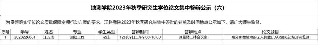 为贯彻落实学位论文质量保障专项行动方案的要求,现将我院2023年秋季研究生集中答辩的名单及时间地点公示如下,请广大师生监督。