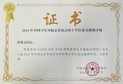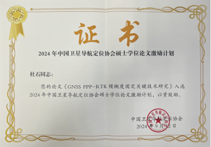 近日,经学位论文评审委员会终评,2024年度中国卫星导航定位协会论文激励计划评选结果出炉,本年度全国共评选出10篇优秀硕士学位论文,我校2022届硕士研究生杜石的学位论文《GNSS PPP-RTK模糊度固定关键技术研究》成功入选2024年度中国卫星导航定位协会硕士学位论文激励计划,指导老师为黄观文教授。