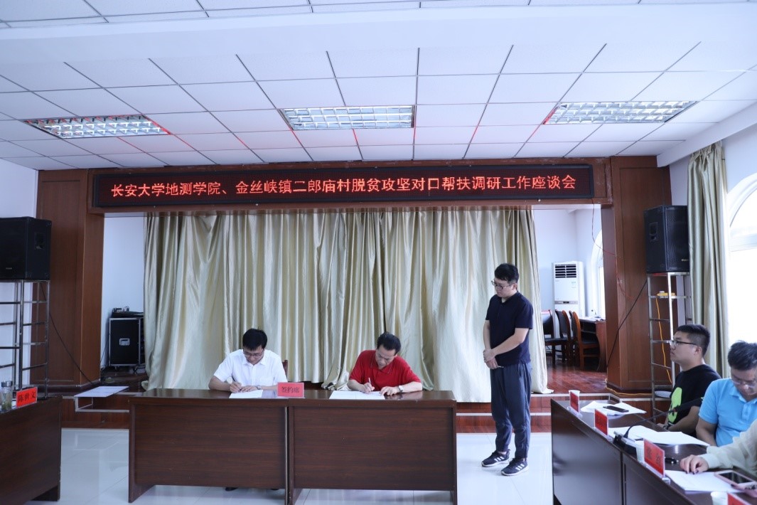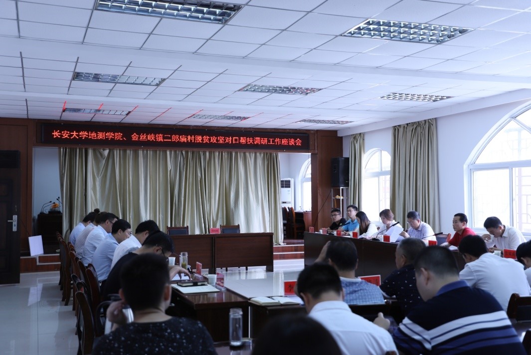 9日上午,在金丝峡镇政府举行了对口帮扶调研工作座谈会,会议由我校挂职干部、商南县委常委、副县长黄飞主持,他对杜福元书记一行的到来表达了欢迎和感谢,并希望结对双方能够深入贯彻习近平新时代中国特色社会主义思想,抓住机遇,勇于创新,为商南县的脱贫攻坚工作注入新动力。会上,商南县人民政府党组成员、金丝峡景区管委会主任赵有群,金丝峡镇党委副书记、镇长张学林和金丝峡镇二郎庙村驻村第一书记李革分别汇报了地方脱贫攻坚工作相关情况。随后,杜福元书记和张学林镇长分别代表地测学院党委和金丝峡镇党委签订了《党建结对帮扶协议书》,并进行“地测学院党委党建扶贫村”授牌仪式。仪式结束后,杜福元书记代表地测学院党委讲话,他指出,脱贫攻坚工作是决胜全面建成小康社会三大攻坚战之一,具有十分重要的政治意义和战略意义,对于地测学院党委,党建结对帮扶不仅是一项重要的政治任务,更是发挥学院服务社会功能的重要途径,后期,学院会根据调研情况和地方需求,发挥学科与人才优势,统筹各类资源,在阵地建设、技能培训、产业发展和消费扶贫等方面为地方脱贫攻坚工作做出贡献。