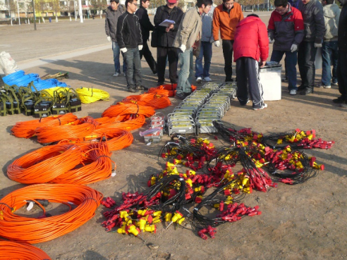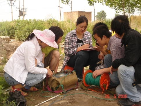 学生在进行室外地震资料采集实验